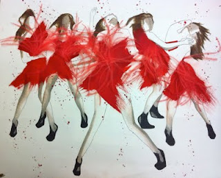 2.Praise: I instantly fell in love with the color pallet of this piece. The red makes a statement of boldness and keeping the rest in neutral colors makes it cohesive. The splatter effect, as well as the feathers, all make the piece more interesting to the eye and give the painting depth and dimension. My favorite part is the overlapping and movement of the figures. It gives us a story and sets a tone. Many could interpret it differently, but I as I see the figures formed this way I feel energy and the excitement of dancing.
